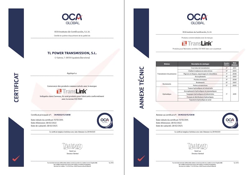 Tous les produits de transmission de puissance, roulements et hydraulique Translink disposent d’un système de qualité certifié selon la norme ISO 9001.